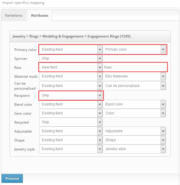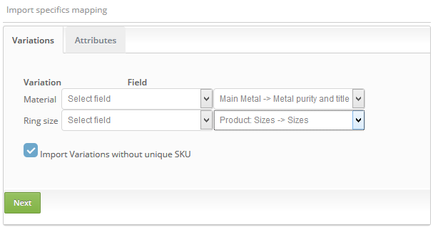 - if checked, variations of the listing which don't have their own SKUs are imported. Valigara will automatically create SKUs for the relevant products